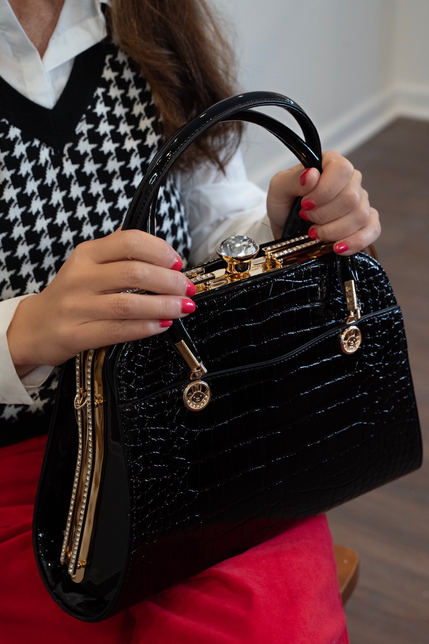 You'll definitely leave a stylish impression with our Embossed Croc Patent Handbag! Shiny faux croc print on patent leather shapes this too-cute bag that features rectangular silhouette with a flat bottom design and a structured top handle. Undo our embellished kiss lockclasp closure at the front to reveal a lined interior with a sidewall zipper pocket and plenty of room for your daily necessities. Detachable matching strap is included so you can have a variety of styling options!