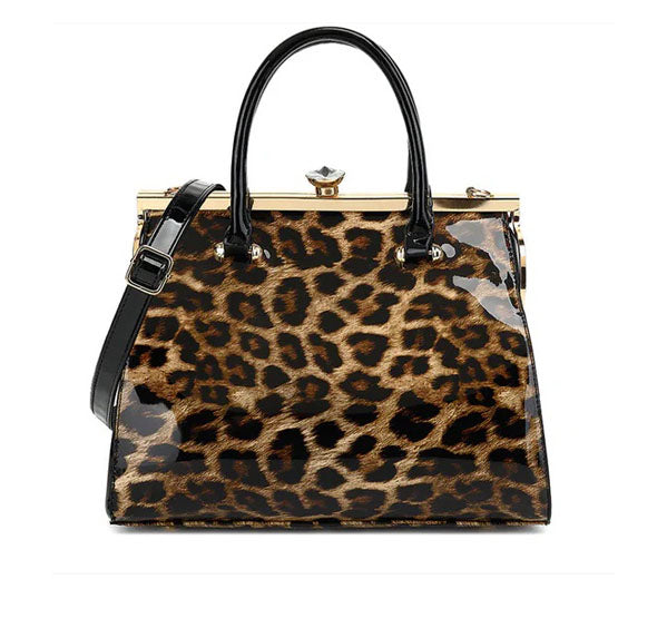Introducing "The City Kitty," a luxurious patent leather handbag in a bold leopard print that effortlessly combines elegance with everyday functionality. This designer frame satchel, adorned with a sparkling rhinestone clasp, is the perfect accessory to elevate your style.